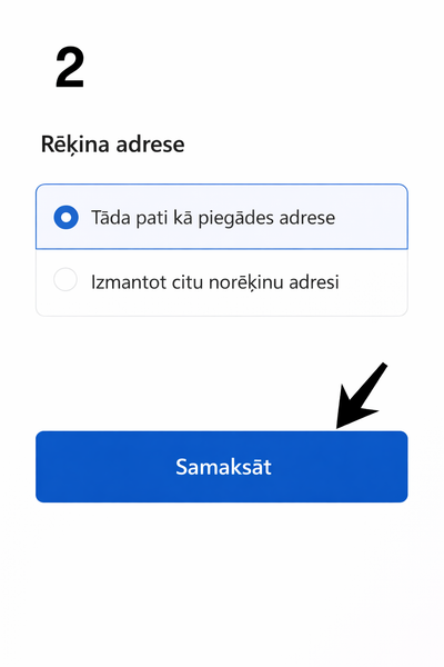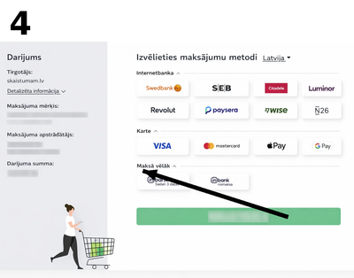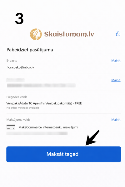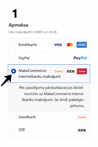 1. Izvēlieties produktus Pievienojiet vēlamos produktus grozam. 2. Noformējiet pasūtījumu Aizpildiet piegādes informāciju un izvēlieties sev ērtāko sūtīšanas metodi. 3. Izvēlieties apmaksas metodi Apmaksas sadaļā izvēlieties: MakeCommerce internetbanku maksājumi (skat. Attēls Nr.1) 4. Dodieties uz apmaksu Nospiediet pogu “Samaksāt” (skat. Attēls Nr.2) 5. Pārbaudiet pasūtījuma informāciju Pārliecinieties, ka visa informācija ir pareiza, un spiediet “Maksāt tagad” (skat. Attēls Nr.3) 6. Izvēlieties “Maksāt vēlāk” opciju Apmaksas metodēs atrodiet sadaļu “Maksāt vēlāk” un izvēlieties vienu no iespējām: - Sadali 3 daļās - Nomaksa (skat. Attēls Nr.4) 7. Pabeidziet noformēšanu Sekojiet sistēmas norādēm un apstipriniet izvēlēto nomaksas risinājumu.